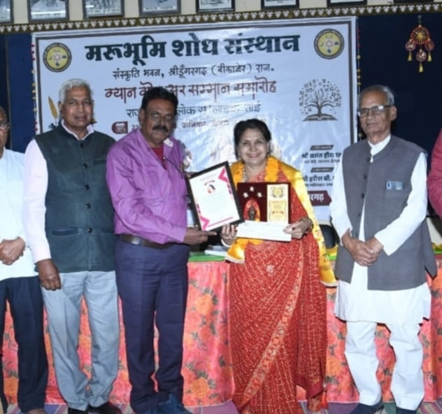कोटा। ”मरूभूमि शोध संस्थान’ श्रीडूंगरगढ़, बीकानेर के तत्वावधान में ‘ अंतर्राष्ट्रीय हिन्दी दिवस’ को अनेक समरोहों के रूप भव्य एवं गरिमामय रूप से मनाया गया. इस अवसर पर कोटा की साहित्यकार डॉ. कृष्णा कुमारी को उनके राजस्थानी काव्य -संग्रह ‘अस्यो छै म्हारो गाँव’ को इस वर्ष का प्रतिष्ठित पुरस्कार ‘पं. मुखराम सिखवाल स्मृति राजस्थानी साहित्य सृजन पुरस्कार’ समारोहपूर्वक प्रदान किया गया। उन्हें सम्मान- पत्र, प्रतीक चिन्ह, उपरणा और 11,000 रु की नगद राशि प्रदान की गई,। यह पुरस्कार शिवप्रसाद सिखवाल परिवार, श्रीडूंगरगढ़ के सौजन्य से दिया गया। श्री विनोद सिखवाल एवं उनका परिवार भी उपस्थित रहे। उल्लेखनीय है कि कृष्णा कुमारी की प्रस्तुत कृति राजस्थान सरकार द्वारा समग्र शिक्षा के अंतर्गत प्रत्येक विद्यालय द्वारा क्रय की गई है. इसके दो संकरण प्रकाशित हैं.